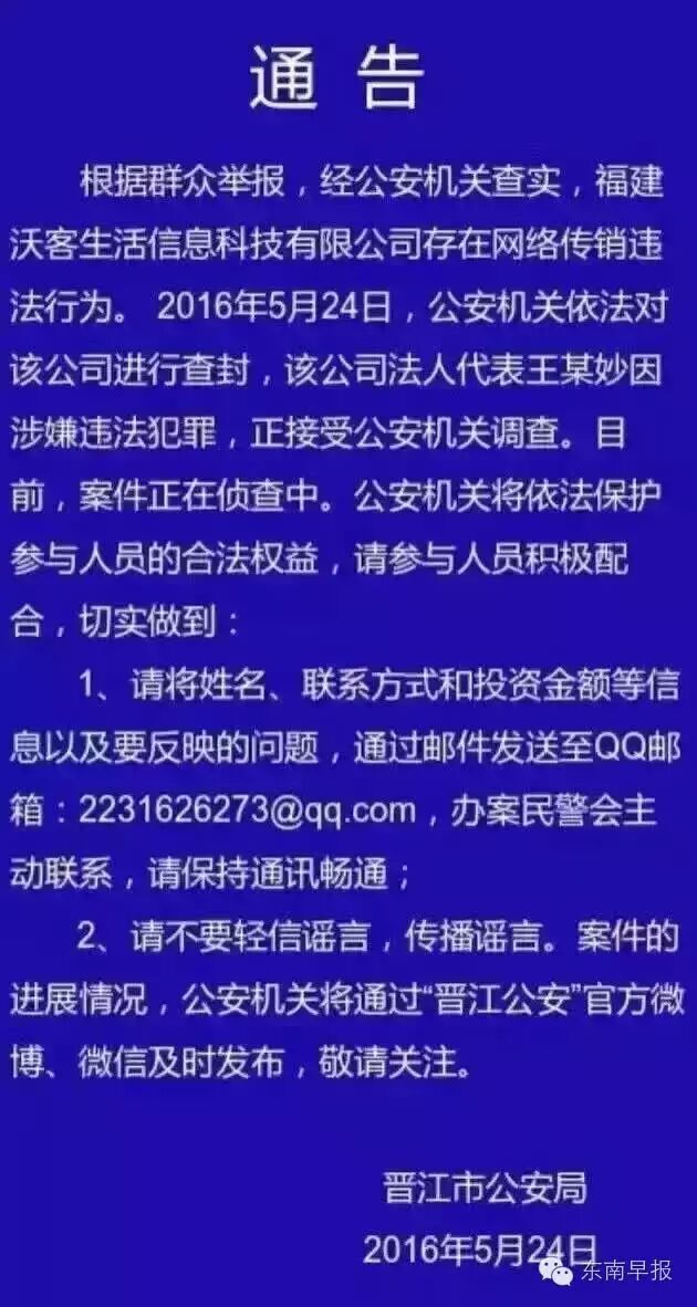 2016年5月24日,公安機關(guān)依法對福建沃客生活信息科技有限公司進行查封,該公司法人代表王某妙因涉嫌違法犯罪,接受公安機關(guān)調(diào)查。
