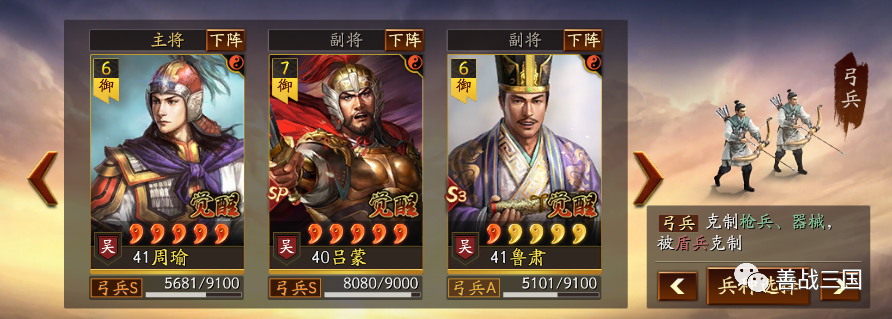 第二套都督弓則可以把周瑜換成陸遜,陸遜戰法帶當鋒和兵無,兵書奇正/文韜/執銳,加全智,主公可以根據自身情況靈活配隊。