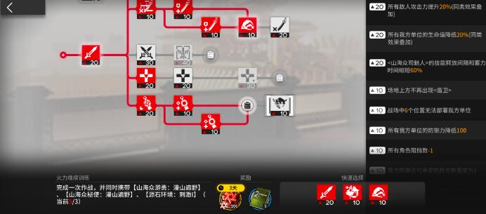 火力維序訓(xùn)練:完成一次作戰(zhàn),并同時攜帶【山海眾游勇:漫山遍野】、【山海眾游秘使:漫山遍野】和【源石環(huán)境:刺激 I】