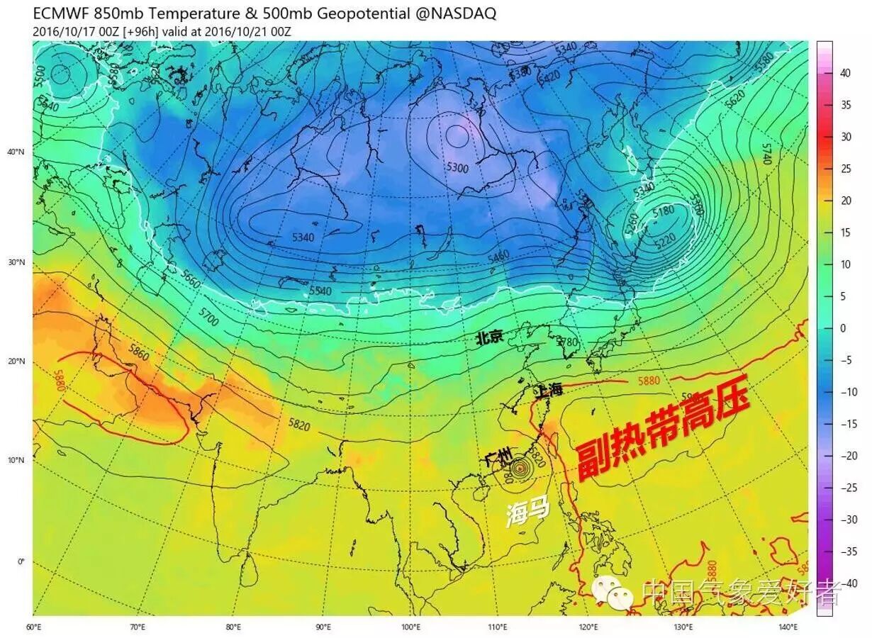 10月17號、21號臺風和副高位置變化圖,可見海馬撞斷了副高,在21號開始急轉彎。