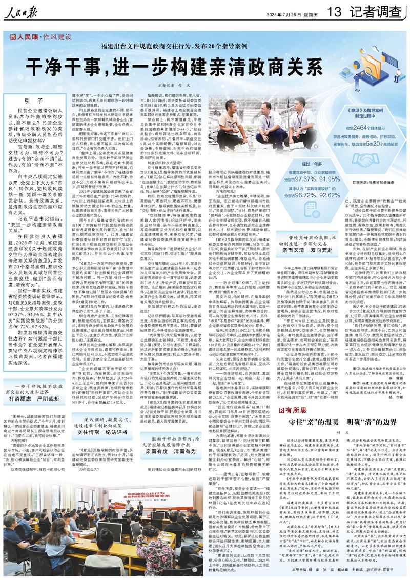 7月25日,《人民日報》第13版整版發布記者調查文章,聚焦福建出臺文件規范政商交往行為、發布20個指導案例,規范政商交往行為:《干凈干事,進一步構建親清政商關系》,一起來看詳情——