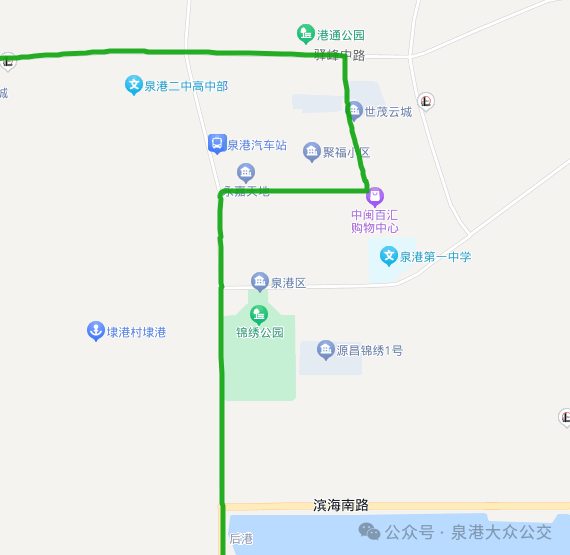 暫不行經:新百匯、泉港一中(學府路)、泉港行政中心(區政府)、泉港郵政局、陳莊安置區、泉港汽車站等公交站點