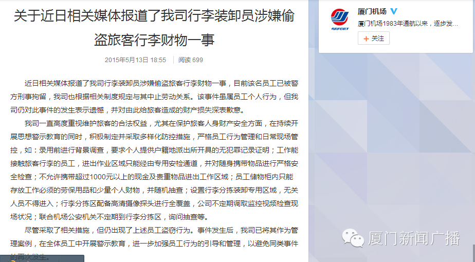 聲明中還表示,廈門機場一直高度重視維護旅客的合法權益,尤其在保護旅客人身財產安全方面,在持續開展思想警示教育的同時,積極制定并采取多樣化防控措施,嚴格員工行為管理和日常現場管控,如錄用前進行背景調查,要求個人提供戶籍地派出所開具的無犯罪記錄證明;工作能接觸旅客行李的員工,進出作業區域只能經由專用安檢通道,并對隨身攜帶物品進行嚴格安全檢查;不允許攜帶超過1000元以上的現金及貴重物品進出工作區域;員工儲物柜內只能存放工作必須的勞保用品和少量個人財物,并隨機抽查;設置行李分揀裝卸專用區域,無關人員不得進入;行李分揀區配備高清攝像探頭進行全覆蓋,公司不定期調取監控視頻檢查現場狀況;聯合機場公安機關不定期到行李分揀區,詢問抽查等。 盡管采取了相關措施,但仍出現了上述員工盜竊行為。事件發生后,機場方面已將其作為管理案例,在全體員工中開展警示教育,進一步加強員工行為的引導和管理,以避免同類事件的再次發生。